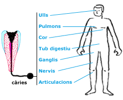 Una dent malalta amenaça tot l’organisme. La càries és un important problema sanitari i econòmic. Tot i que la situació és molt diferent de la de fa un anys, continua suposant una factura molt alta. La infecció de les dents es pot escampar a través dels vasos sanguinis i arribar a altres llocs del nostre organisme. Aquestes complicacions poden ser molt greus perquè poden afectar tot l’organisme. |
